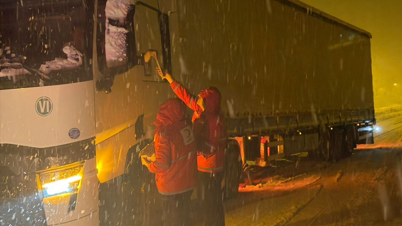 Yolda ilerlemekte güçlük çeken 80 araçtaki yaklaşık 180 kişiye kek ve meyve suyu ikramında bulunan Kızılay ekipleri, bazı araçları iterek sürücülere yardımcı oldu.